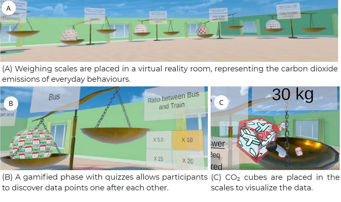The vr experience used in the experiment showing (A) the first stage of the data exploration phase with the ordering of GHG emission sources, (B) the second stage of the data exploration phase with the quiz-based gamification condition (Hg) and (C) the data visceralization phase with the enactment condition (He).